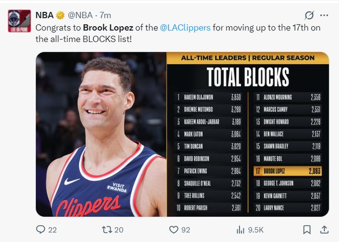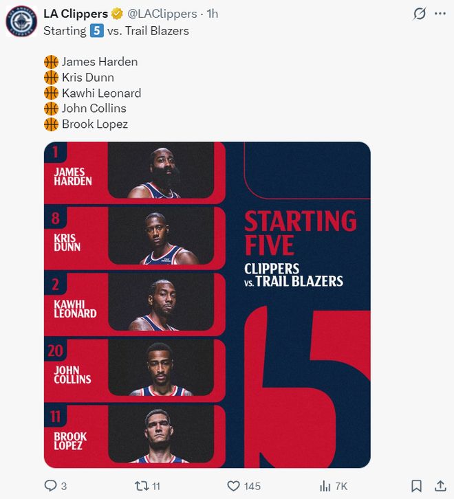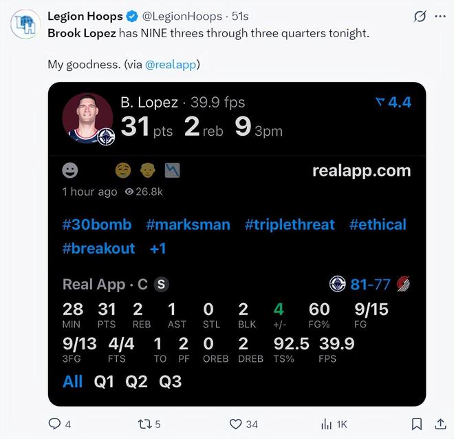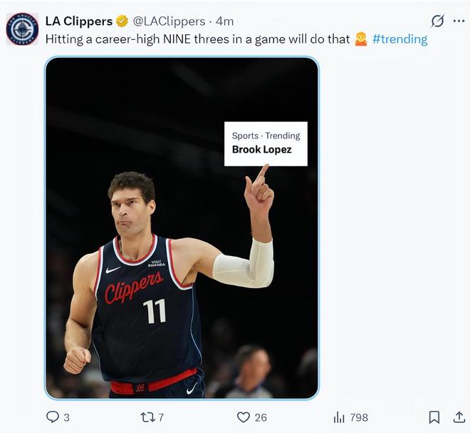 全場比賽大洛33分鐘,三分14中9,拿到31分5籃板1助攻2蓋帽,三分命中率64.2%,就連快船官方都寫道這個夜晚的大洛直接登上了全美第一熱搜,37歲單場命中9個三分球以上的球員只有詹姆斯、庫里、大洛三人。