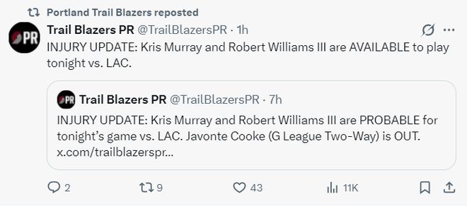 開拓者:阿夫迪亞29分9助攻9籃板,夏普16分,卡馬拉20分3籃板,克林根10分8籃板,樂福14分,羅威4分12籃板。
