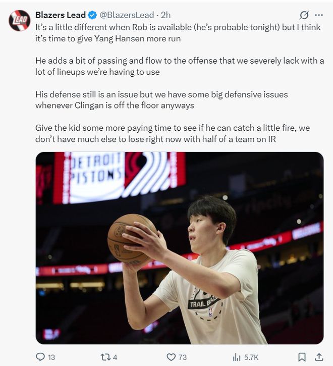 拓媒:我認為開拓者應該給楊瀚森更多的登場時間。(但這場比賽楊瀚森并沒有獲得任何的登場時間)