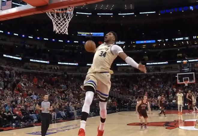 比賽還剩最后7秒,落后7分的公牛已經(jīng)放棄不打,準(zhǔn)備結(jié)束比賽,而字母哥拿球一人沖向前場,大秀一記大風(fēng)車扣籃。
