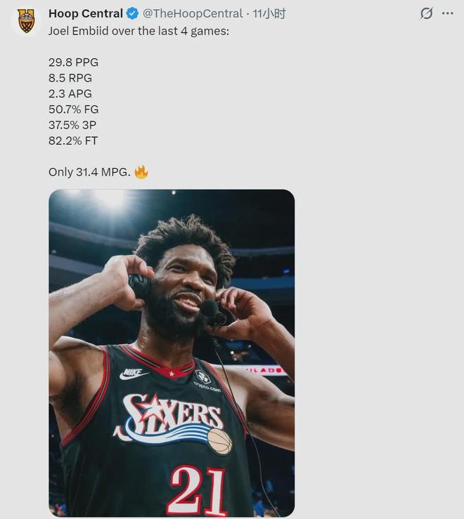 恩比德狀態(tài)回暖,過去4場比賽,他場均砍下29.8分8.5籃板2.3助攻,投籃命中率50.7%,三分命中率37.5%,罰球命中率82.2%。這4場比賽,恩比德一共得到45記罰球,命中了37記。有點尷尬的是,在這期間球隊只有1勝3負(fù)。