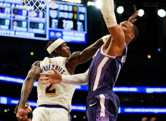 回顧一下比賽,開場詹姆斯就突破上反籃,東契奇單打+老詹空切和反擊炸扣,湖人開局勢頭很猛,而國王就依靠德羅贊連拿6分回應(yīng)。中段威少突然命中三分,隨后連續(xù)喂餅雷諾和德羅贊,威少繼續(xù)順下上籃,湖人則依靠東契奇單打守住微弱領(lǐng)先優(yōu)勢。后半段老詹帶銜接段,尼克史密斯和拉拉維亞多點(diǎn)開花,老詹也命中三分,第一節(jié)湖人30-24國王。進(jìn)入第二節(jié),蒙克下三分雨追分,湖人替補(bǔ)今天突然爆發(fā),尼克史密斯和范德比爾特接連下三分雨,拉拉維亞突破,湖人頂住了國王反撲壓力。