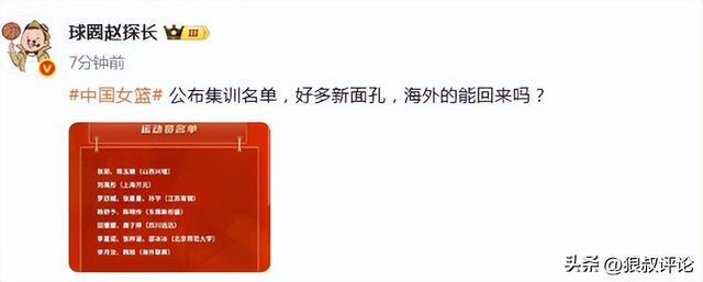 媒體人“趙探長(zhǎng)”發(fā)文點(diǎn)評(píng):中國(guó)女籃集訓(xùn)名單,好多新面孔,海外的能回來(lái)嗎?