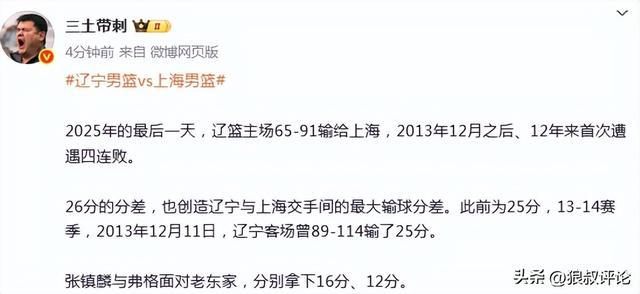 媒體人“三土帶刺”發(fā)文點(diǎn)評(píng):“2025年的最后一天,遼籃主場(chǎng)65-91輸給上海,2013年12月之后、12年來首次遭遇四連敗?!?/p>
