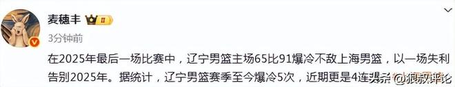 在2025年最后一場(chǎng)比賽中,遼寧男籃主場(chǎng)65比91爆冷不敵上海男籃,以一場(chǎng)失利告別2025年。據(jù)統(tǒng)計(jì),遼寧男籃賽季至今爆冷5次,近期更是4連爆。