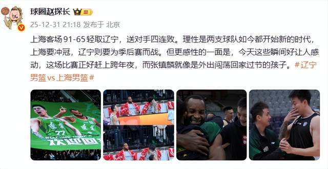 球圈趙探長(zhǎng)表示:上??蛨?chǎng)91-65輕取遼寧,送對(duì)手四連敗。理性是兩支球隊(duì)如今都開始新的時(shí)代,上海要沖冠,遼寧則要為季后賽而戰(zhàn)。但更感性的一面是,今天這些瞬間好讓人感動(dòng),這場(chǎng)比賽正好趕上跨年夜,而張鎮(zhèn)麟就像是外出闖蕩回家過節(jié)的孩子。