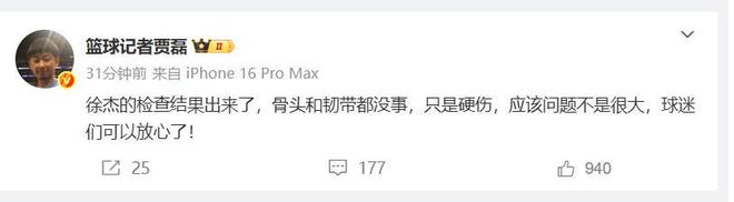 那么說徐杰現(xiàn)在傷情怎么樣了?不妨來看看籃球記者賈磊的報道,賽后第一時間,賈磊就公布了徐杰的最新傷情報告,好消息是,徐杰的骨頭和韌帶都沒事,只是硬傷,賈師傅認為徐杰應(yīng)該問題不是很大,球迷們可以放心了!