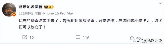 根據(jù)籃球記者賈磊爆料,徐杰的檢查結(jié)果出來了,骨頭和韌帶都沒事,只是硬傷,應(yīng)該問題不是很大,球迷們可以放心了。