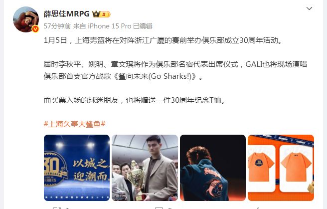 薛思佳報(bào)道:“1月5日,上海男籃將在對陣浙江廣廈的賽前,舉辦俱樂部成立30周年活動(dòng)。屆時(shí)李秋平、姚明、章文琪將作為俱樂部名宿代表出席儀式,GALI也將現(xiàn)場演唱俱樂部首支官方戰(zhàn)歌《鯊向未來(Go Sharks!)》?!?/p>