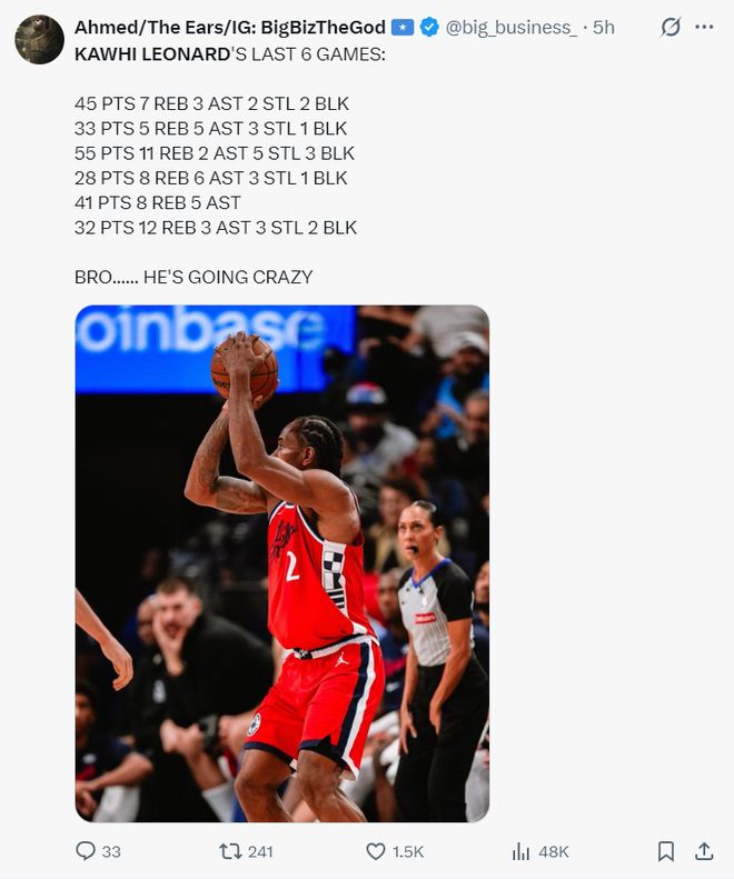 快船贏球的第一功臣肯定是倫納德,他已經(jīng)被球迷們譽為戰(zhàn)神卡,此役他在末節(jié)14中8+三分8中4,拿到20分1籃板3助攻1搶斷炸裂無比,全場比賽39分鐘,29中16,三分16中6,罰球9中7,拿到45分7籃板3助攻2搶斷2蓋帽,命中率55.2%,三分命中率37.5%。