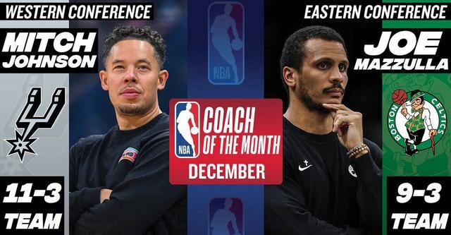北京時間1月3日,NBA官方正式公布2025-26賽季12月的月最佳教練,圣安東尼奧馬刺的主教練米奇-約翰遜與波士頓凱爾特人的主教練喬-馬祖拉分別當選。