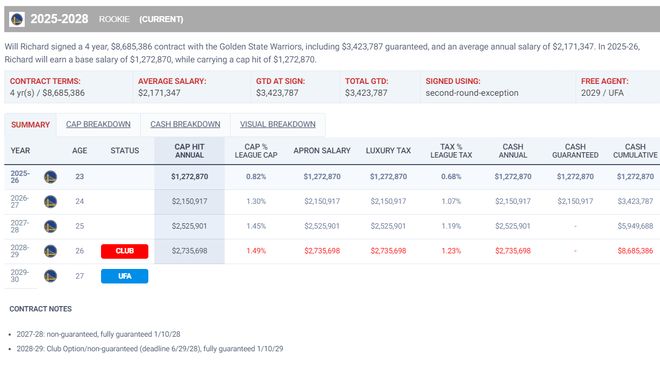 理查德跟勇士簽下的四年868萬的新秀底薪,本賽季的薪水只有127萬美元,但他已經(jīng)有一場30+,兩場20+。