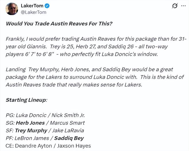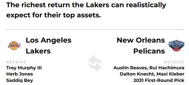 他建議湖人送出里夫斯、八村壘、克內(nèi)克特、克勒貝爾、2031年湖人不保護首輪去鵜鶘換特雷-墨菲、赫伯特-瓊斯、薩迪克-貝,也就是換來三個鋒線資產(chǎn)。