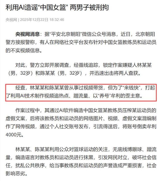 12月10日,中國籃協(xié)發(fā)布官方聲明,明確指出網(wǎng)上流傳的"王思雨控訴宮魯鳴"視頻為AI偽造的虛假信息,造謠者的目的是挑動(dòng)矛盾、非法牟利。