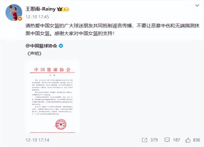 隨后,王思雨本人也第一時(shí)間轉(zhuǎn)發(fā)了籃協(xié)的聲明,并發(fā)布澄清內(nèi)容。
