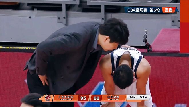 在接下來的一個回合,趁著場上犯規(guī)的空隙,高詩巖來到場邊、扶著膝蓋、低著頭,情緒接近崩潰。這破防的一幕,更像是擊垮心理防線的最后一根稻草。主教練邱彪不停地安慰他,明白他心的壓力。