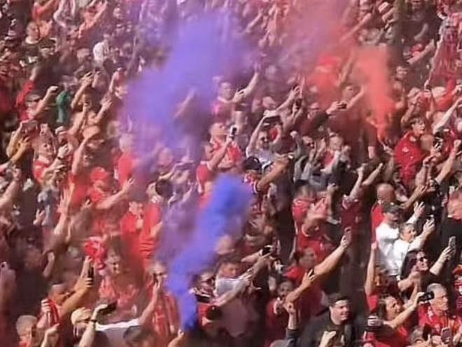 上賽季英超第34輪,利物浦5-1托特納姆熱刺提前奪得聯(lián)賽冠軍,一位埃弗頓球迷則在安菲爾德球場外出售了藍色煙霧彈,“戲弄”了一把利物浦球迷。