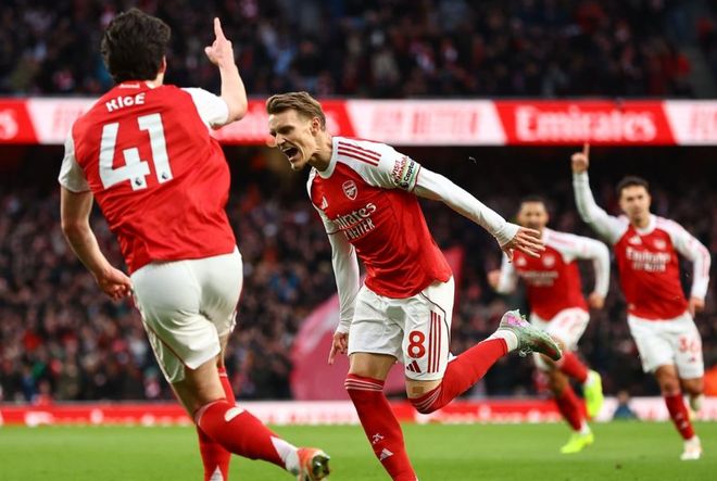 比賽剛開始不久,哲凱賴什獲得非常好的機(jī)會(huì),他在禁區(qū)前沿的一腳凌空射門沒有打上力量。門將倒地把球撲住。隨后,薩卡突入禁區(qū)右側(cè),小角度射門,被擋了出去。第14分鐘,阿森納進(jìn)球了!厄德高在禁區(qū)前沿起腳遠(yuǎn)射,皮球鉆入球門近角!這是厄德高本賽季的首粒進(jìn)球!