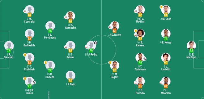 阿斯頓維拉首發(fā):23-大馬丁、2-卡什、4-孔薩、3-林德洛夫、22-馬特森(83'12-迪涅)、44-卡馬拉(83'26-博加德)、8-蒂萊曼斯、7-麥金(58'8-阿馬杜·奧納納)、10-布恩迪亞(58'19-桑喬)、27-羅杰斯、17-馬倫(58'11-沃特金斯)