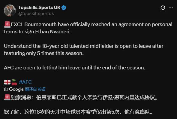 北京時間12月28日,據(jù)《天空體育》的轉(zhuǎn)會專家Top Skills稱,阿森納18歲新星恩瓦內(nèi)里已與伯恩茅斯就賽季后半段租借加盟達(dá)成個人協(xié)議。據(jù)了解,這位中場球員本賽季英超僅替補出場5次(實際為6次),他有意離隊。阿森納方面已同意讓他離隊直到賽季結(jié)束。