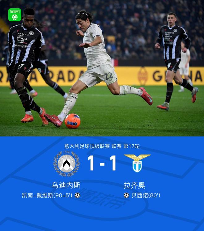 北京時間12月28日,意甲聯(lián)賽第17輪,烏迪內(nèi)斯坐鎮(zhèn)主場迎戰(zhàn)拉齊奧。第80分鐘,拉齊奧由貝西諾射門經(jīng)折射入網(wǎng)。第90+5分鐘,烏迪內(nèi)斯由凱南-戴維斯破門完成絕平。最終,雙方以1-1握手言和。