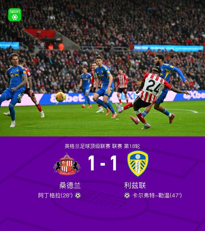 桑德蘭1-1利茲聯(lián),阿丁格拉破門,勒溫扳平