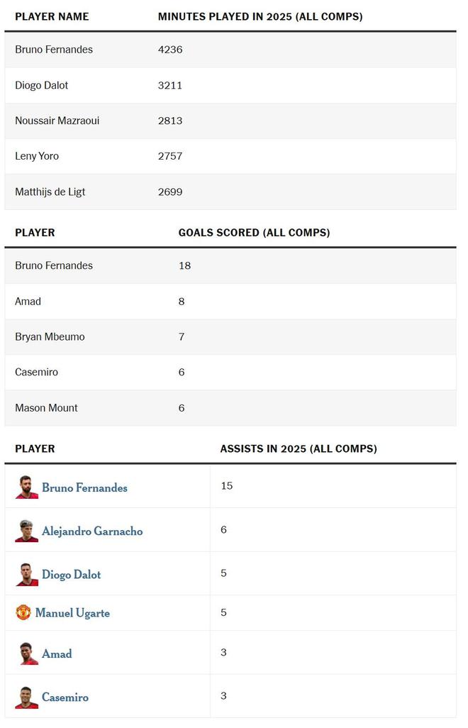 以下是曼聯(lián)球員在1-0戰(zhàn)勝紐卡斯?fàn)柭?lián)后的年度部分排名數(shù)據(jù)。