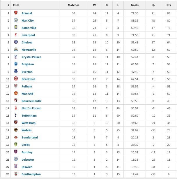 英超2025年積分榜:阿森納83分居首,曼城第二利物浦第四
