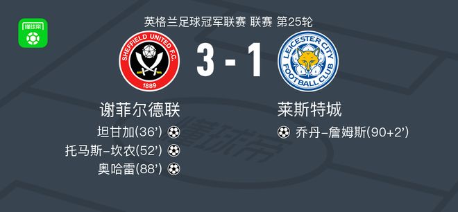 北京時(shí)間1月2日英格蘭足球冠軍聯(lián)賽 聯(lián)賽 第25輪,謝菲爾德聯(lián)主場(chǎng)對(duì)陣萊斯特城。謝菲爾德聯(lián)坦甘加破門(mén),托馬斯-坎農(nóng)破門(mén),奧哈雷破門(mén)。萊斯特城喬丹-詹姆斯破門(mén)。最終比分謝菲爾德聯(lián) 3-1 萊斯特城。