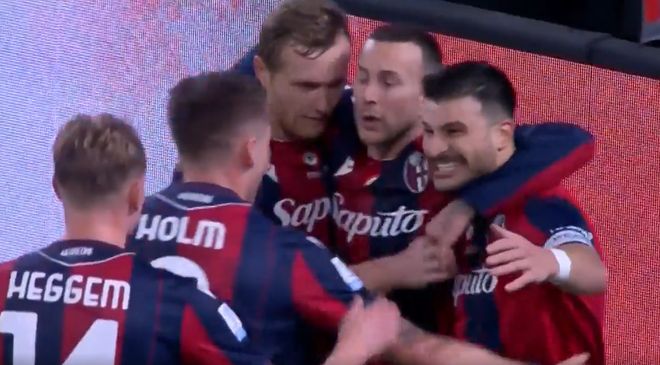25年后國米又一次開場閃擊,有意思的是這次他們也未能笑到最后。落后的博洛尼亞隨后展開猛烈反撲,第21分鐘,博洛尼亞右路壓上,連續(xù)精妙的短傳配合,奧爾索利尼倒三角處回傳,貝爾納代斯基點球點處獲得很好的機(jī)會,只是他兜射打的太正,門將馬丁內(nèi)斯穩(wěn)穩(wěn)將球撲住。第31分鐘,博洛尼亞左路快速反擊,比塞克回防頭球解圍時出現(xiàn)低端失誤,竟然將球頂?shù)阶约菏稚稀V鞑糜H自觀看VAR后吹了點球,奧爾索利尼操刀主罰一蹴而就,博洛尼亞1:1扳平比分。