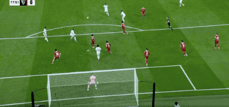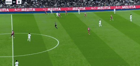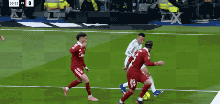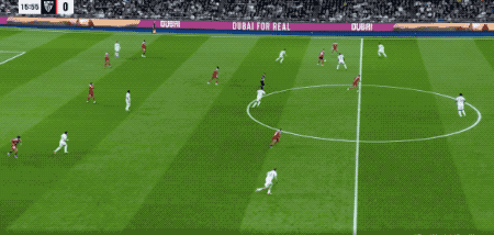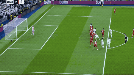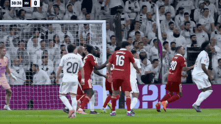 第37分鐘,皇馬獲得前場右側(cè)的任意球,居萊爾將球開出,貝林厄姆在防守球員的干擾下,頭球破門,皇馬取得領(lǐng)先。