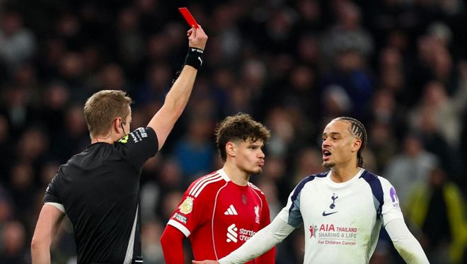 第30分鐘,西蒙斯背后出腳,直接踩在了國家隊(duì)老大哥范迪克的跟腱上,VAR介入后,裁判取消黃牌判罰,直接向西蒙斯出示紅牌。